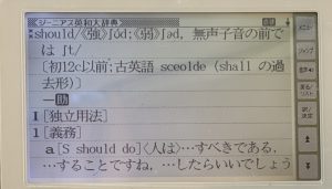 shouldをジーニアス英和大辞典で引くと、「shallの過去形」(下に[義務]とか書いてありますが、論証するとジーニアス英和大辞典もこの部分に関しては間違えているようです)
